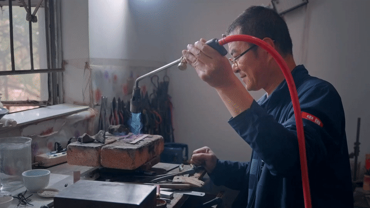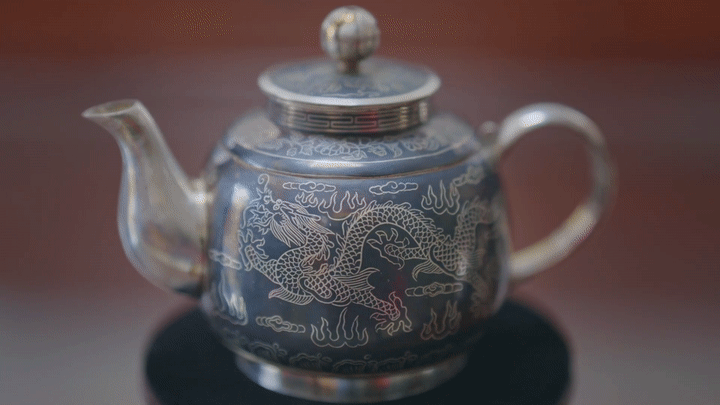 乌铜走银制作技艺项目省级代表性传承人袁昆林,怀着对传统工艺的敬仰与热爱,三十年间不断延伸技艺,其设计的“满天星”工艺展现出独具魅力的艺术价值。该工艺是在胎体图案之外的部分,用小锤和錾子敲击出密集的小圆点,将融化的白银填充到小圆点中,形成状若满天繁星的样子,故名“满天星”。