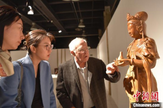 当地时间8月12日,巴西圣保罗州坎皮纳斯市,“中国艺术五千年 塞奎拉·莱特收藏”启幕。图为巴西文物修复师毛罗·里贝罗(右一)讲解如何修复木雕观音像。中新社记者 林春茵 摄