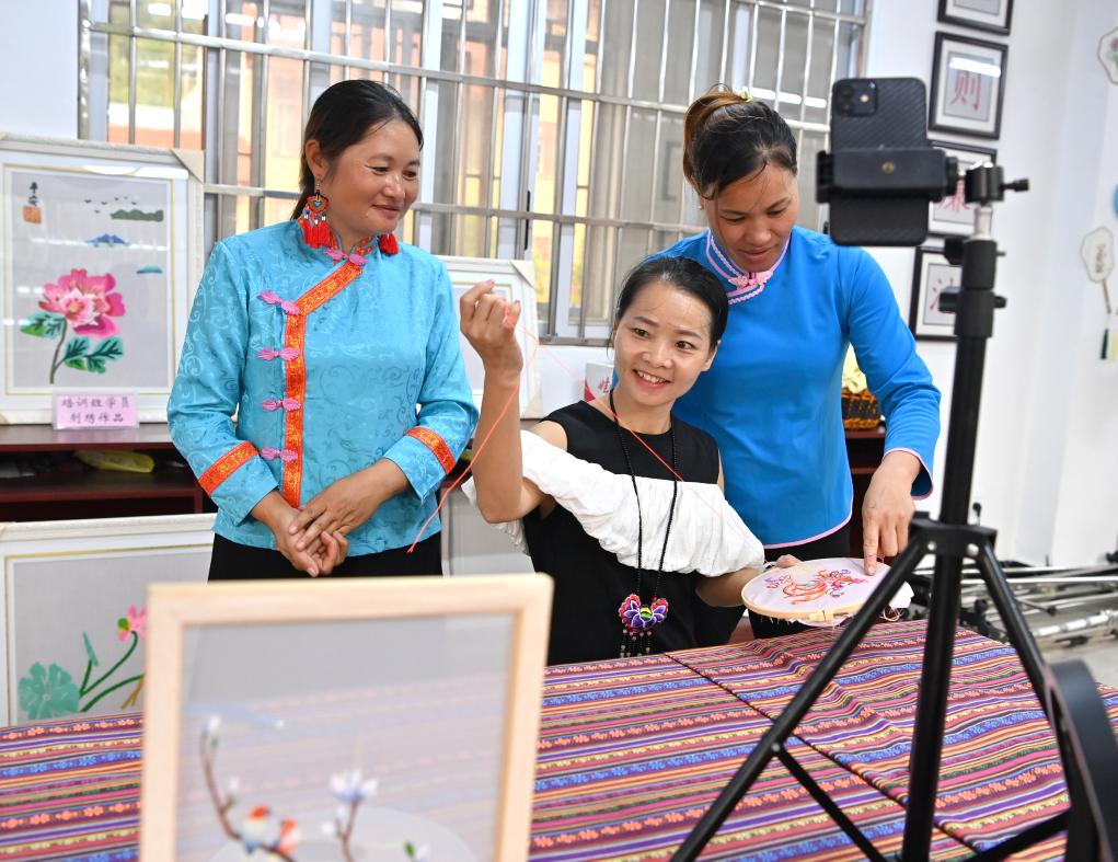 “我从小就跟着奶奶学刺绣,后来又跟着姑姑、阿姨学,在学习中不断创新,已经以七里刺绣为基础创作了12种工艺品。我要让七里刺绣走出大山,让越来越多的人接受;让七里刺绣走进学校,走近孩子,让阿奶的手艺代代相传。”广西百色市田东县义圩镇朔晚村村民凌漫丽说。