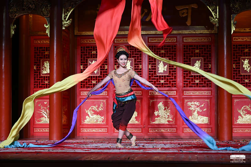 活动通过《凭栏仙女》《反弹琵琶》《六臂飞天》《敦煌长绸舞》《千手观音》等敦煌舞节目,不仅展现了“反弹琵琶”等最具代表性的敦煌舞姿,还通过脱胎于敦煌壁画的“飞天”“千手观音”等形象,再现敦煌艺术的美轮美奂。