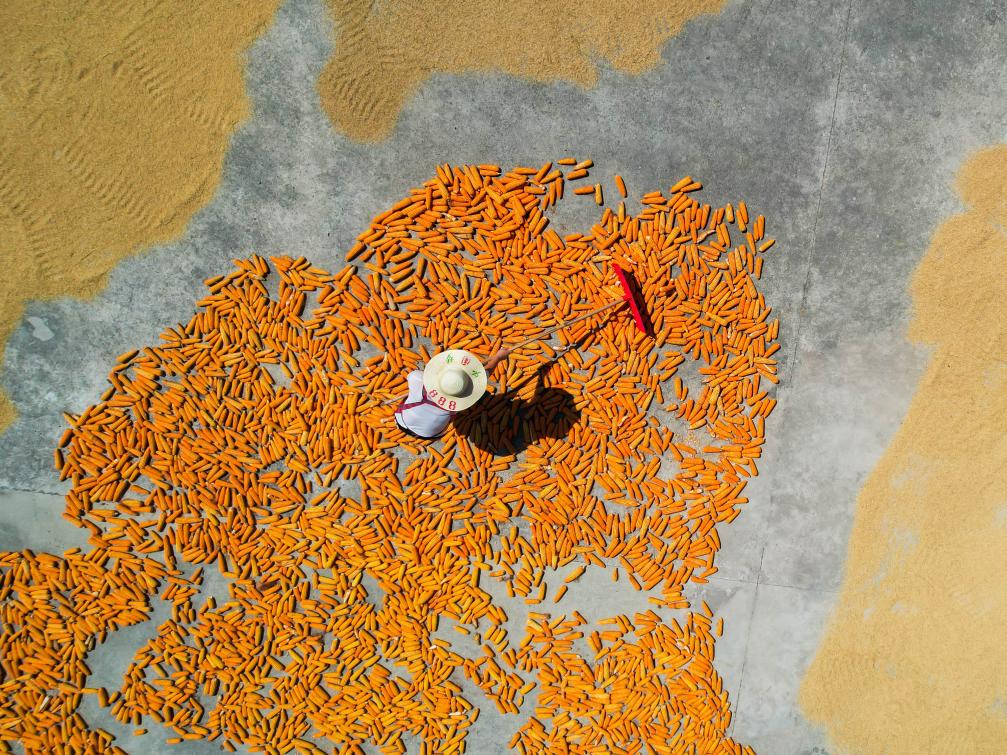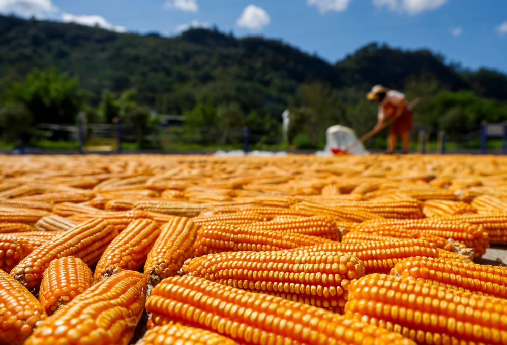 初秋时节,贵州省黔南布依族苗族自治州罗甸县村民利用晴好天气,在房前屋后晾晒稻谷、玉米、砂仁等农作物,呈现喜人丰收景象。