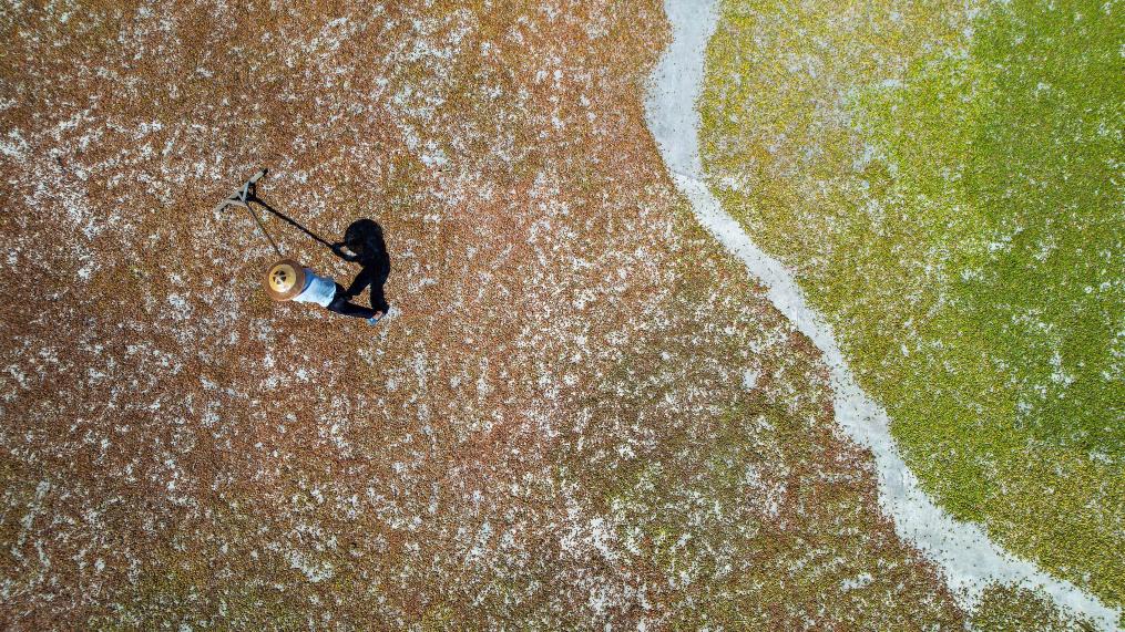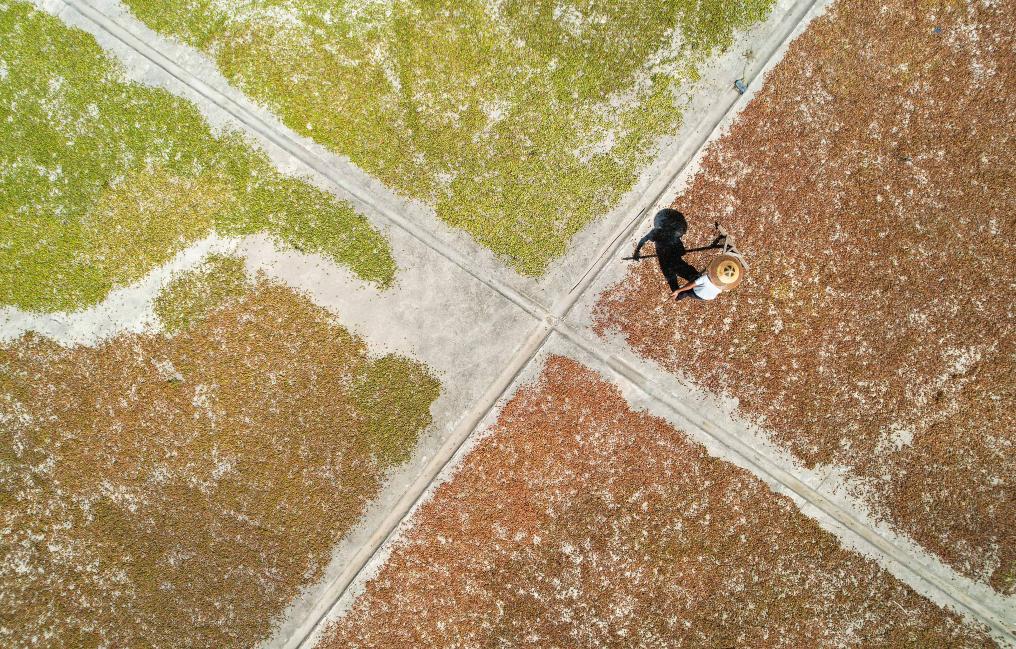 ↑2024年8月27日,村民在贵州省黔南布依族苗族自治州罗甸县沫阳镇访里村晾晒砂仁。(无人机照片)CICPHOTO/史传鸿