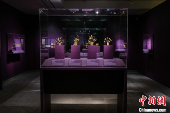 据介绍,此次展示的文物包括雕塑、铜镜、砚台、印章、马具、陶器、金饰品等,亮点之一是一系列金步摇。金步摇在佩戴者行走时随步摇曳,闪闪发光。这种名为步摇的花枝状冠饰源于西域并通过丝绸之路传入北方地区,在辽西地区流行,并成为三燕文化的典型器物。