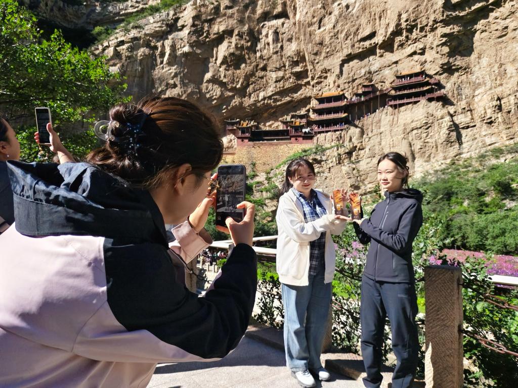 在山西大同悬空寺的文创店里,游客为购买一款流沙冰箱贴排起长队。冰箱贴被晃动后,金色流沙缓缓落下,伫立千年的悬空寺显露出来,好似从历史长河中沉淀千年之后来到游客面前。