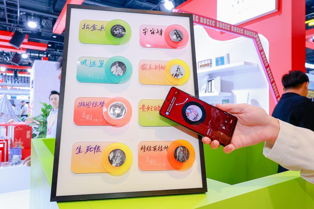 “京剧印章”采用渐变色工艺,将众多京剧热词组合而成“京剧”两个大字,印纸的镂空设计使其成为打卡“取景框”。观众可以在展位内“框”住美景,打卡专属的“京剧之约”,留下属于自己的服贸会记忆。
