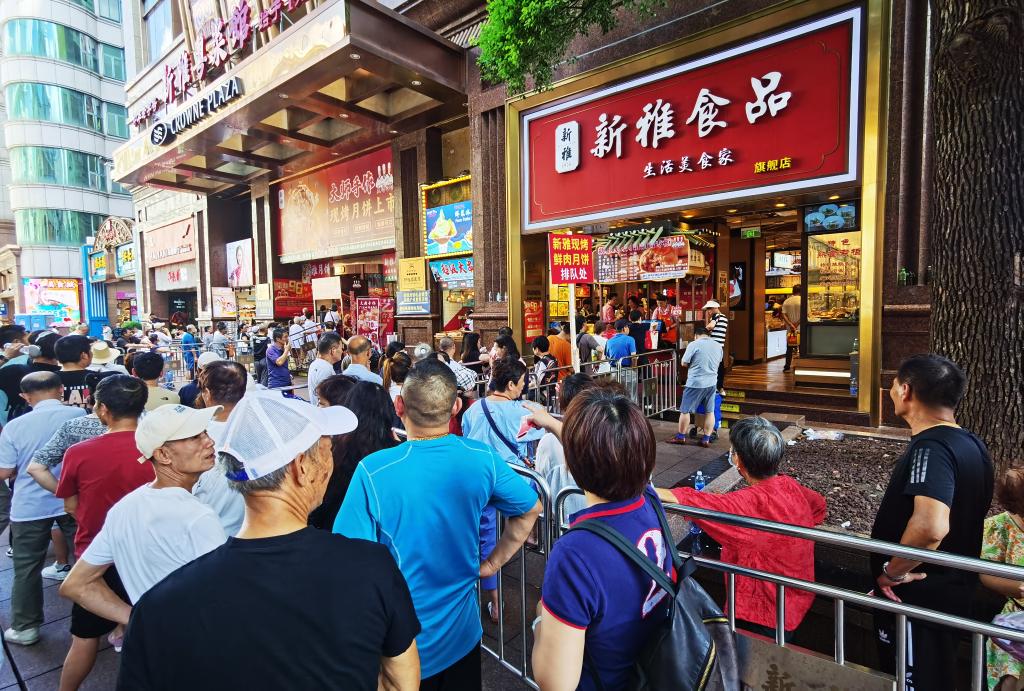 在上海南京路步行街,自8月中下旬开始,新雅粤菜馆南京东路总店现烤月饼迎来销售高峰,日均现烤月饼销量达10万个,中秋节前夕日销量更是翻番。今年新推出的现烤糟香鲜肉月饼,引入了手工吊糟技艺,对于喜欢糟味的南方消费者来说既新鲜又亲切。