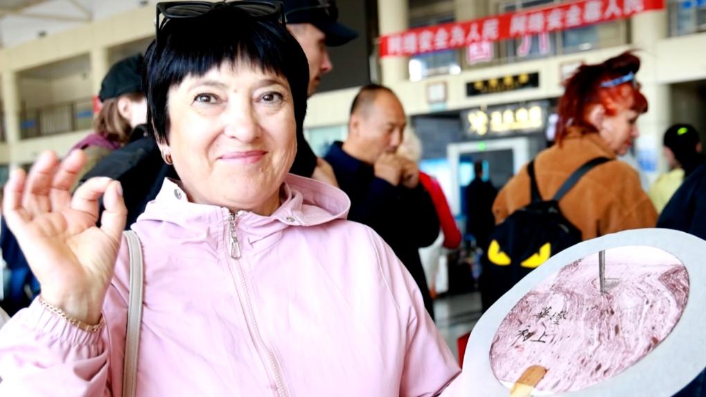 在黑河口岸外籍游客信息服务中心,外国游客们体验了中国传统技艺——漆扇制作,用色彩和笔触绘出中秋意境。