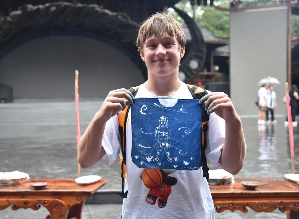 克莱恩紧紧握着他的蜡染杰作,迫不及待地向记者展示。“瞧,我画了个威武的战士!”他一脸兴奋地说。富有创意的他把自己一直喜爱的文化元素和新学的苗族蜡染手艺巧妙地结合起来。