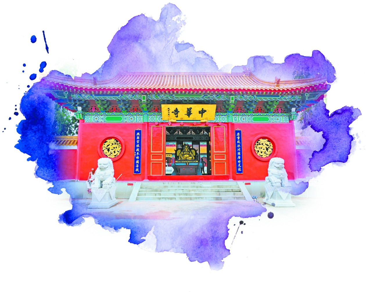 在这样的背景中,中华寺格外醒目——红墙黄瓦,气势恢宏。寺门的殿宇中央立着一尊鎏金弥勒佛,笑容可掬地迎接往来人群,令身在异乡的中国游客倍感亲切。门上匾额的“中华寺”三字由爱国宗教领袖赵朴初题写。门两侧的对联写着:历雪域冰川溯唐时足迹,兴兰宫桂殿参佛国菩提。