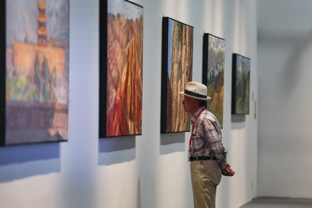 9月22日,与会嘉宾在参观丝路丹青·敦煌映像——美术精品展。