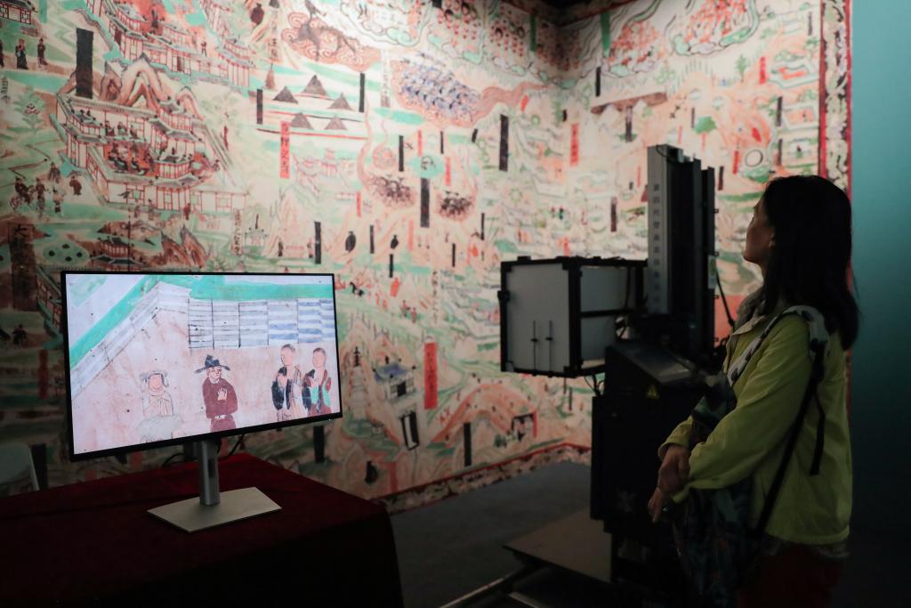 9月22日,在敦煌研究院“典范”“高地”建设成果展上,游客参观莫高窟壁画高保真自动拍摄装置。
