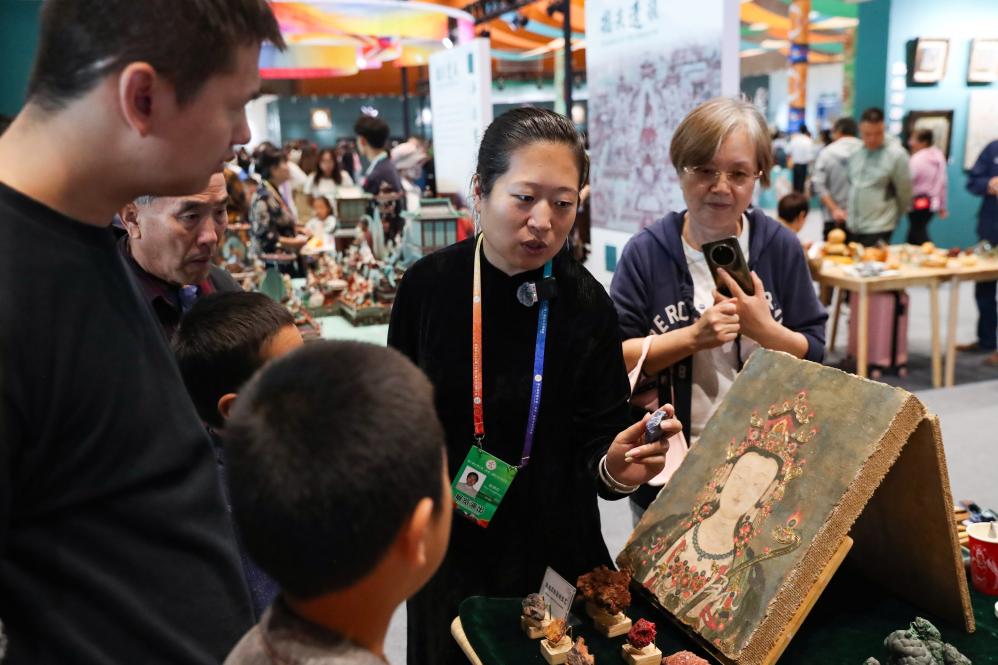 9月22日,在匠心传承·创意绽放——非遗及文创精品展上,敦煌石粉彩绘非遗传承人为游客介绍一件敦煌壁画文创产品。