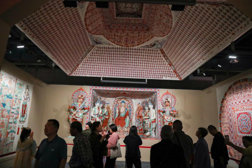 9月22日,在敦煌研究院“典范”“高地”建设成果展上,游客参观莫高窟第172窟整窟复原临摹成果。