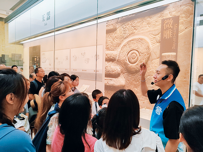 董臻(右一)在良渚博物院作志愿讲解(2024年9月7日摄) 冯源摄/本刊