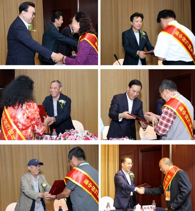 在欢快的乐曲声中,获奖文艺家一一上台领奖,与会领导、专家为他们颁发了荣誉奖牌。张华庆、李冰、刘敏君、王爱红等领导专家分别讲话。福建省的画家孙越、河北省的书法家刘伯玮代表获奖者上台发言,与大家分享了参加大会的收获与喜悦。会后,与会领导专家给获奖文艺家签名,分别合影留念。