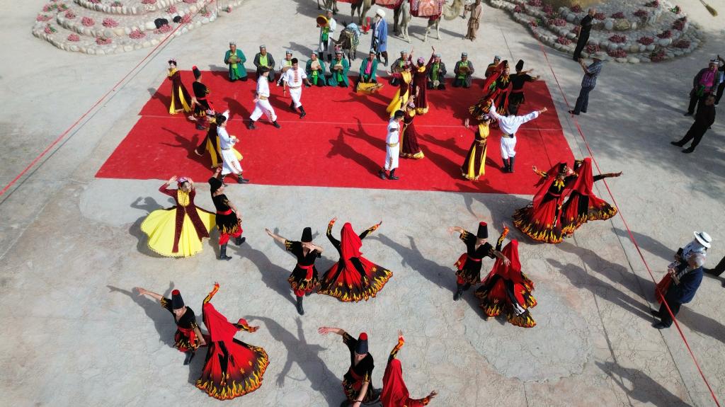 9月25日,演员在位于阿瓦提县的刀郎部落景区表演歌舞(无人机照片)。