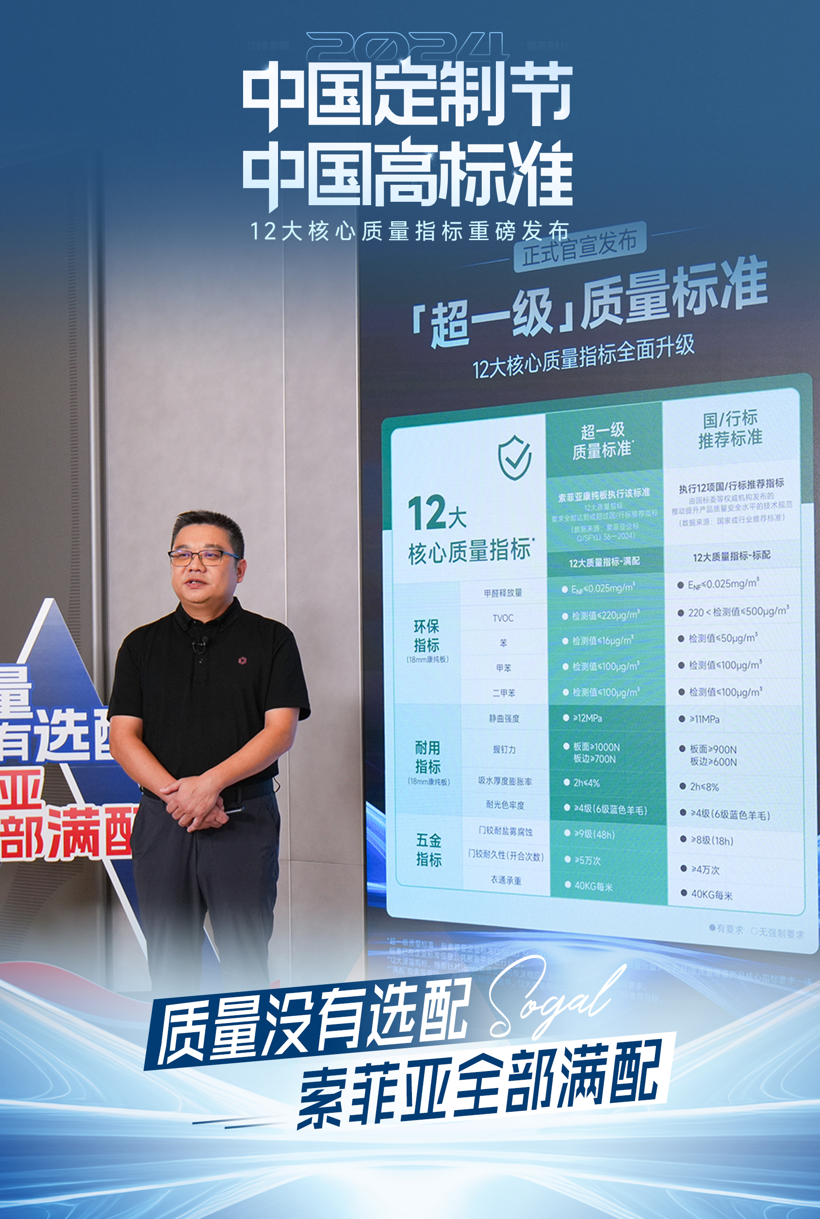 针对消费者对家居环境从基本的功能性转向环保与高品质并重的多元追求,以及市场存在的良莠不齐和信息不对称问题,索菲亚推出“超一级质量标准”从环保、耐用、五金三大维度提出12项严苛的核心质量指标,并承诺“质量没有选配,索菲亚全部满配”,为消费者提供更全面系统、科学的家居选购指引,确保消费者能够享受到更优品质。