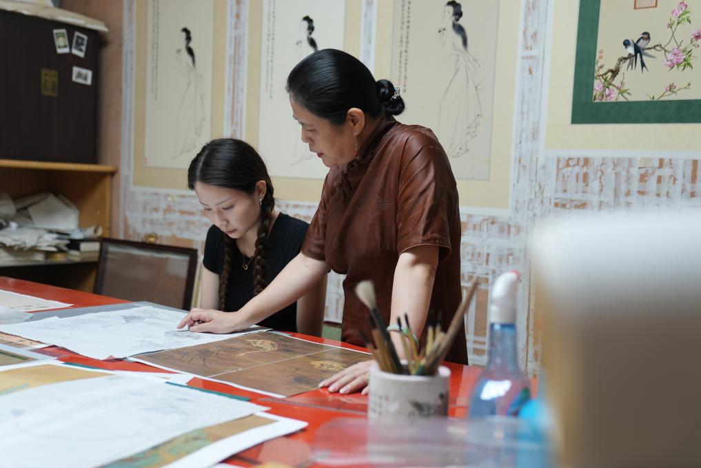 9月25日,在“观绣园”传习所内,卢建英(右)在向女儿潘乃舒讲解勾线方法。
