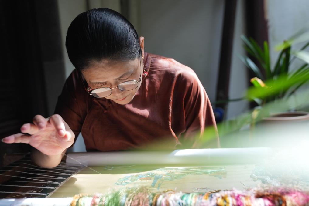 9月25日,卢建英在“观绣园”传习所内刺绣。