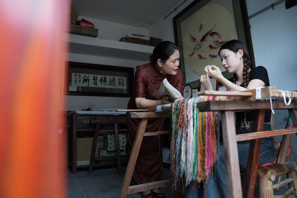 9月25日,在“观绣园”传习所内,卢建英(左)和女儿潘乃舒交流苏绣技艺。