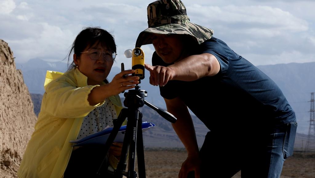 关城外,长城向茫茫戈壁延伸。嘉峪关丝路(长城)文化研究院长城保护研究所所长张斌与同事在嘉峪关长城第二墩附近顶着烈日巡查。他们使用风速仪测量长城墙体底部的风速,并利用无人机采集周边环境影像。