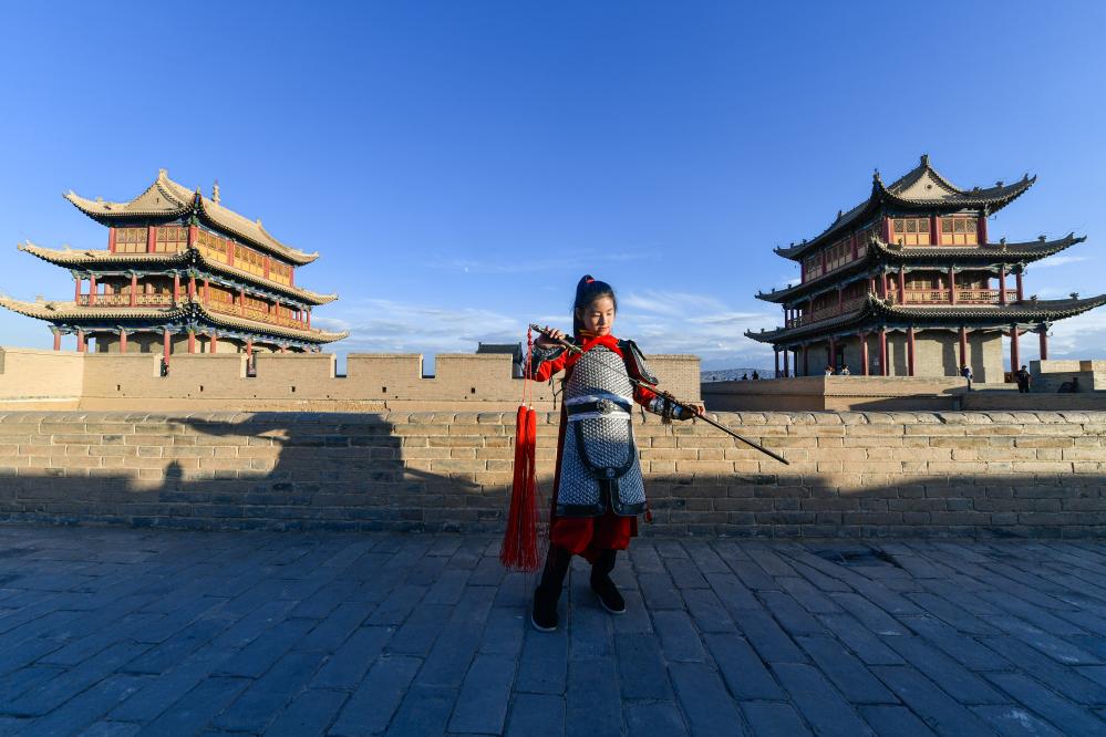 来自安徽合肥的游客俞茂林站在城墙上,用手机定格女儿俞胡元一身戎装、手执长剑的飒爽英姿。“置身古韵犹存的嘉峪关,仿佛梦回大漠边关,就想给孩子拍张酷酷的花木兰古装照。”他笑着说。