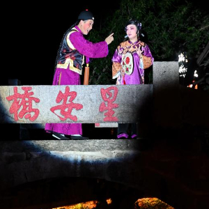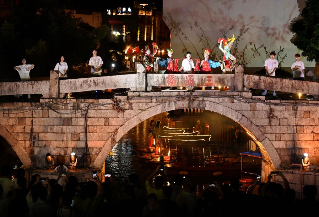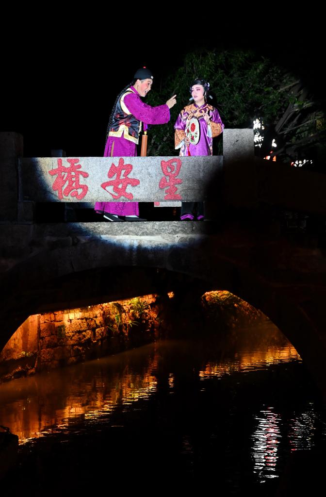 9月30日,演员在福州上下杭三捷河的星安桥上表演新闽剧《贻顺哥烛蒂》。