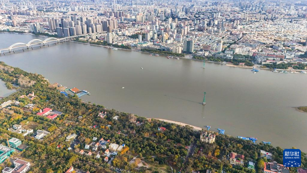 这是10月6日拍摄的哈尔滨市松花江北岸的太阳岛国家湿地公园局部景色与对岸的局部城市景观(无人机照片)。
