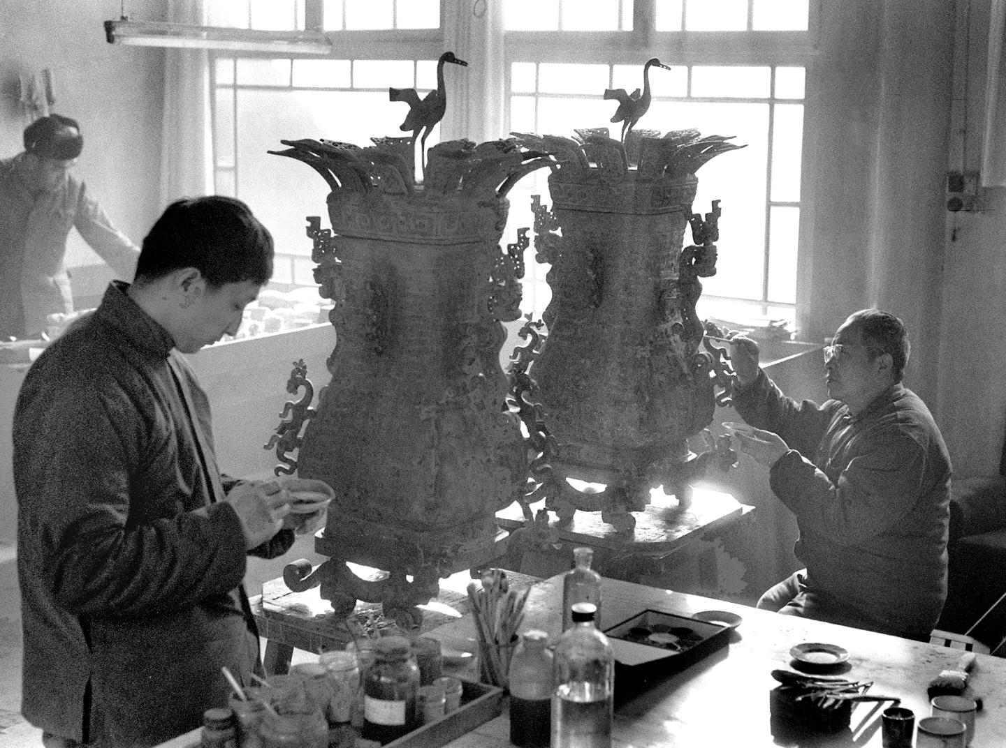 曹静楼看到的这张照片,正在新华社主办的“国社之镜·世纪光影”新闻摄影展上展出。照片上,左边的年轻人正是曹静楼。右侧坐着给莲鹤方壶复制品做浮锈的,是他的师父,故宫博物院青铜器修复专家赵振茂。