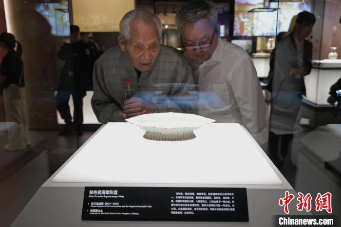 10月11日,民众在浙江吴越文化博物馆观看秘色瓷海棠形盘。 林波 摄