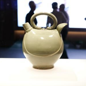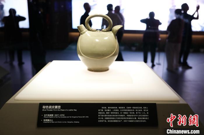 10月11日,浙江吴越文化博物馆展出的秘色瓷皮囊壶。 林波 摄