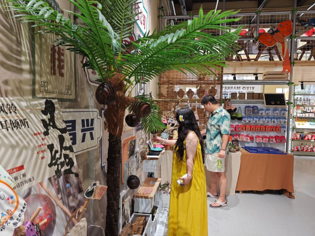 在老街一家非遗文创店里,来自浙江杭州的游客王铷斐正在挑选用椰子壳制作的冰箱贴,准备作为礼物送给朋友。