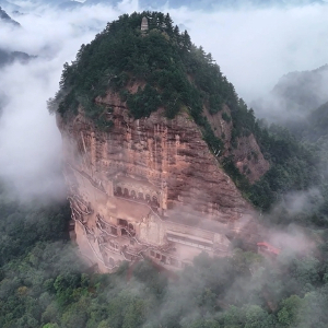 这里是位于甘肃省天水市的麦积山石窟。1600多年前,笃信佛学的后秦皇帝姚兴在此开凿了第一座洞窟。此后,十多个王朝接力营建,造就了这一留存大小窟龛221个、造像3938件10632身、壁画1000余平方米的“东方雕塑陈列馆”。