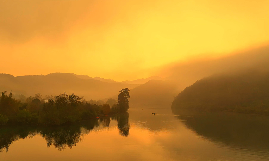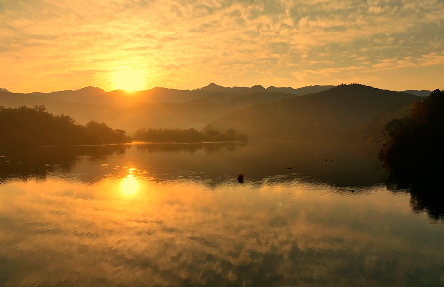 10月29日,在安徽省池州市的秋浦河畔,朝霞与水面相映成趣,泛舟秋浦河仿佛置身仙境。秋浦河是长江支流,风光秀美,因唐代诗人李白的《秋浦歌十七首》等诗作而闻名。新华网发(王帆 摄)