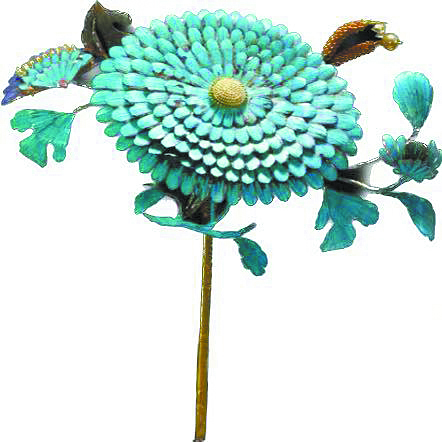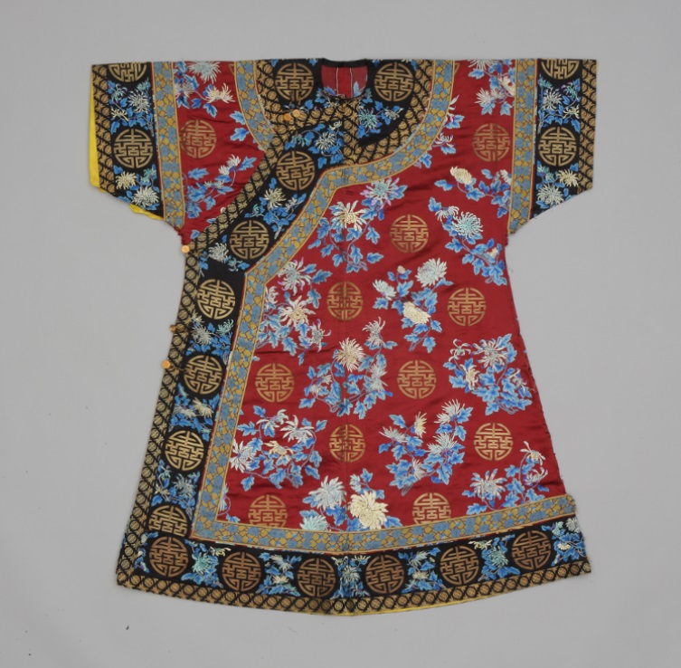 菊不仅代表高洁,也寓意长寿。清代后妃常服上多绣有龙爪菊、虎头菊、贯珠菊、发丝菊、松针菊、万寿菊、牡丹菊、大丽菊等9种菊花,以此“九菊”谐音“久居”,间饰平金团寿,合为“久居长寿”。