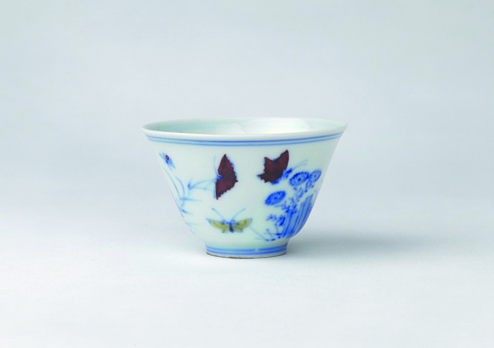 时维九月,序属三秋。紫禁城的秋,就从三秋杯说起。《诗经·王风·采葛》谓:“一日不见,如三秋兮。”秋历三月,孟、仲、季秋,此杯绘兰草、百合、野菊3种花卉,恰为三秋之景,故称“三秋杯”。斟酌间,山石花卉,蝴蝶流连,秋意正浓,让人浮想联翩。三秋杯是明成化斗彩瓷器,收藏界有“清看雍正、明看成化”的说法,意思是雍正的审美属清代最精,成化瓷器则代表了明代最高水平。而提起斗彩,世人只闻鸡缸杯,却不知成化斗彩三秋杯更显物以稀为贵。