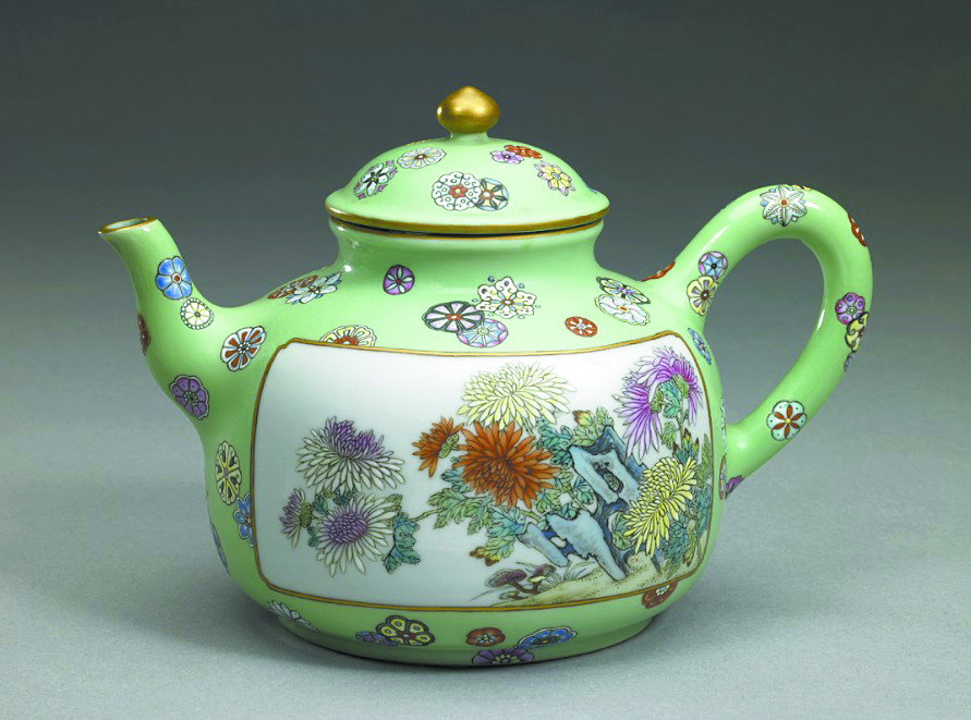 清乾隆款绿地粉彩开光菊石纹茶壶