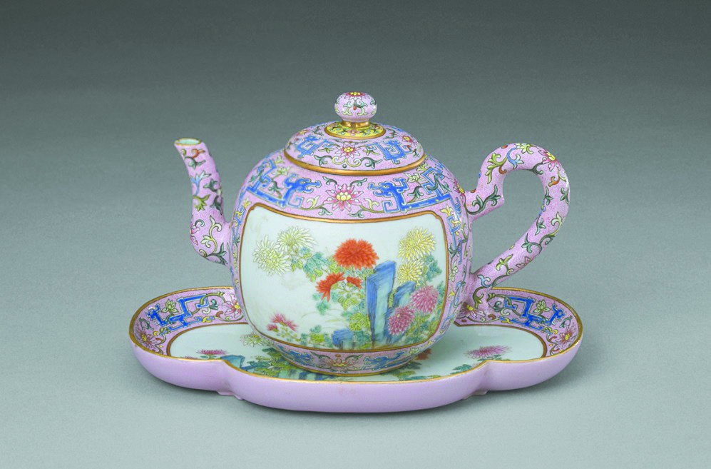 清乾隆款粉地粉彩开光菊花纹茶壶