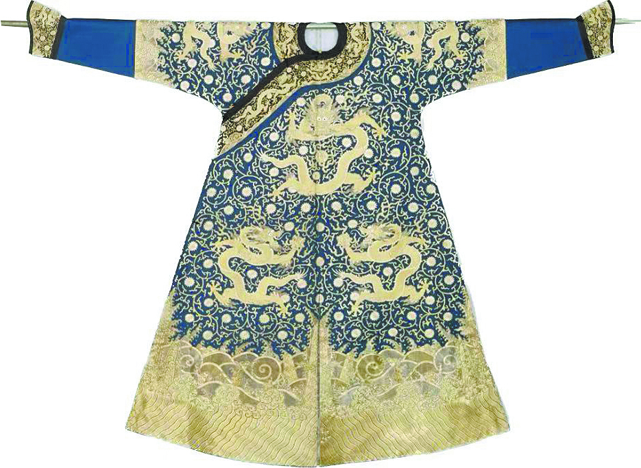 故宫博物院的藏品中有一件清代皇帝吉服,深蓝色为地,以金银线交互换色绣出金银相间的五爪龙及缠枝菊纹,通身流光溢彩、金光灿灿,色调过渡平稳,菊花与龙纹融为一体、相得益彰,既有秋高气爽之韵,又显龙行天下之威,把帝王尊贵与清秋高冷表现得淋漓尽致。