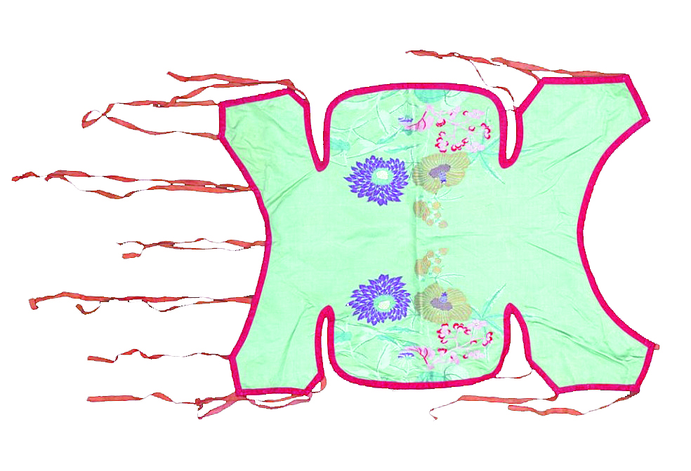 故宫博物院藏有一件清代绿色缎海棠菊花纹狗衣,做工精致、用料考究,通身为绿色织锦缎,用紫、红、蓝、粉等色丝线和金线织成菊花与秋海棠,整体和谐美观、素雅清新。可以想象,秋天的紫禁城里,一只穿着绿色菊花兜衣的小狗,穿过螽斯门,欢快地跑向那个身着菊花衣、头插菊花簪,迎着夕阳余晖向它招手的女主人……