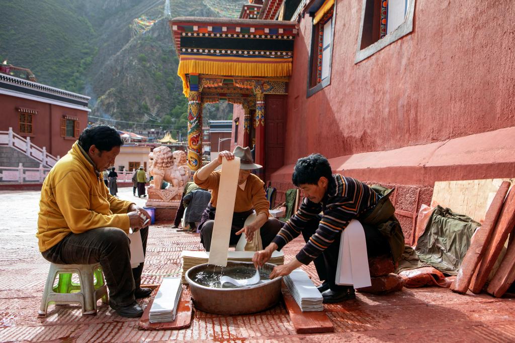 工人在德格印经院外浸泡用于印刷的纸张(2017年5月16日摄)。