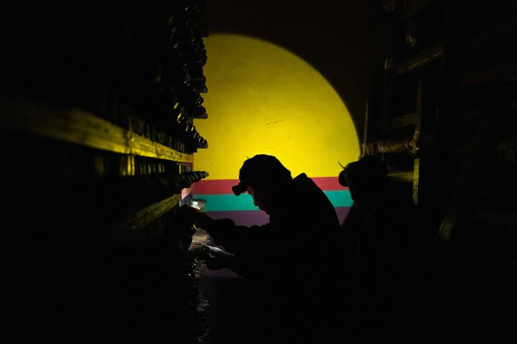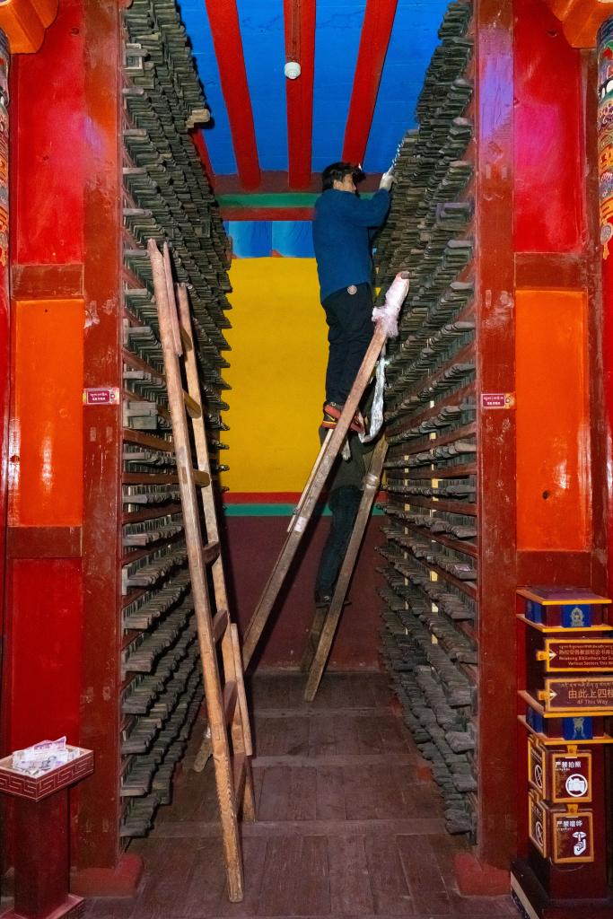 德格印经院的工人按照传统做法清洗、保养院藏印版(2021年10月3日摄)。