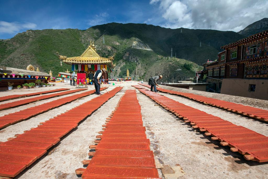 工人在德格印经院的楼顶晾晒院藏印版(2019年6月11日摄)。