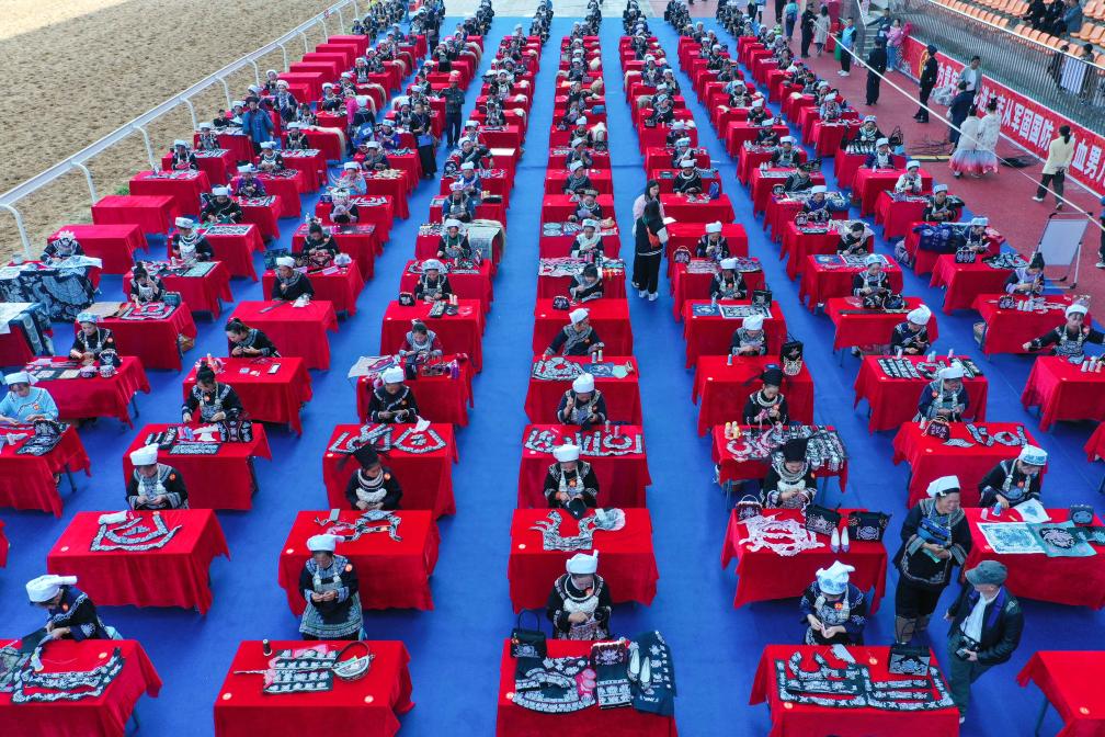 ↑2024年11月2日,民间手工艺人在参加贵州省黔南布依族苗族自治州妇女特色手工技能比赛。(无人机照片)CICPHOTO/肖伟 摄