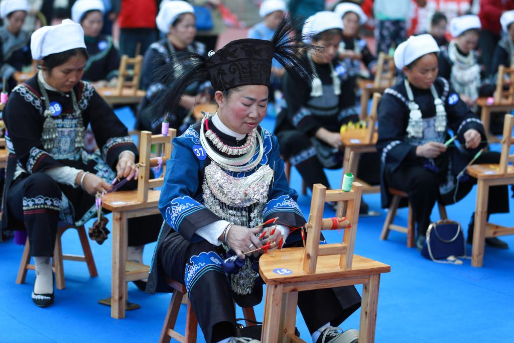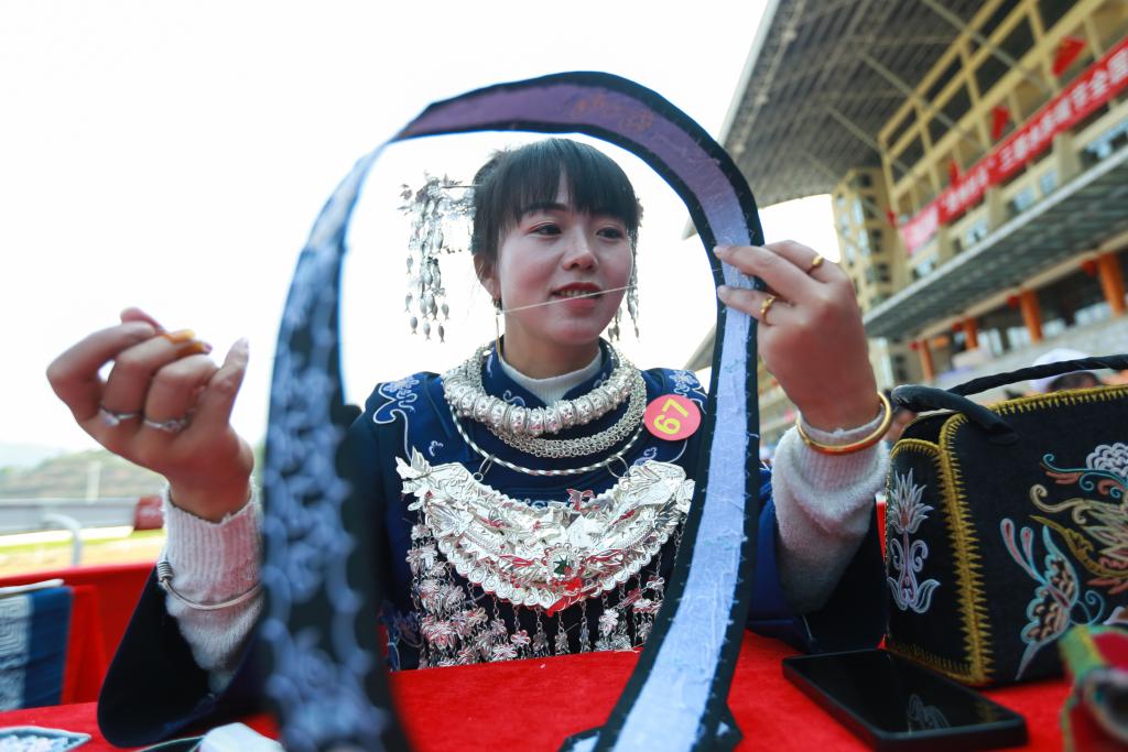 ↑2024年11月2日,民间手工艺人在贵州省黔南布依族苗族自治州妇女特色手工技能大赛中参加辫线比赛。CICPHOTO/肖伟 摄