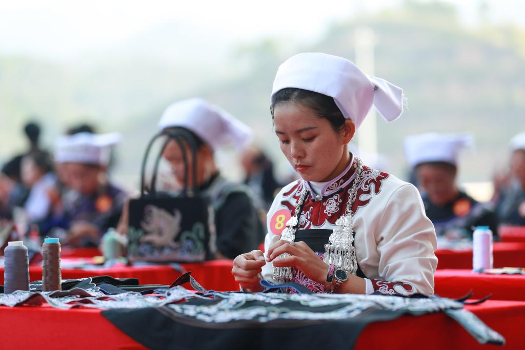 ↑2024年11月2日,民间手工艺人在贵州省黔南布依族苗族自治州妇女特色手工技能大赛中参加刺绣比赛。CICPHOTO/肖伟 摄