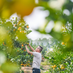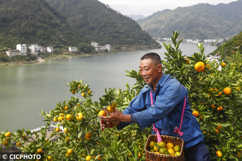 ↑2024年10月17日,安徽省黄山市歙县新溪口乡塔坑村,果农在新安江畔的果园采摘三口柑桔。CICPHOTO/施亚磊 摄