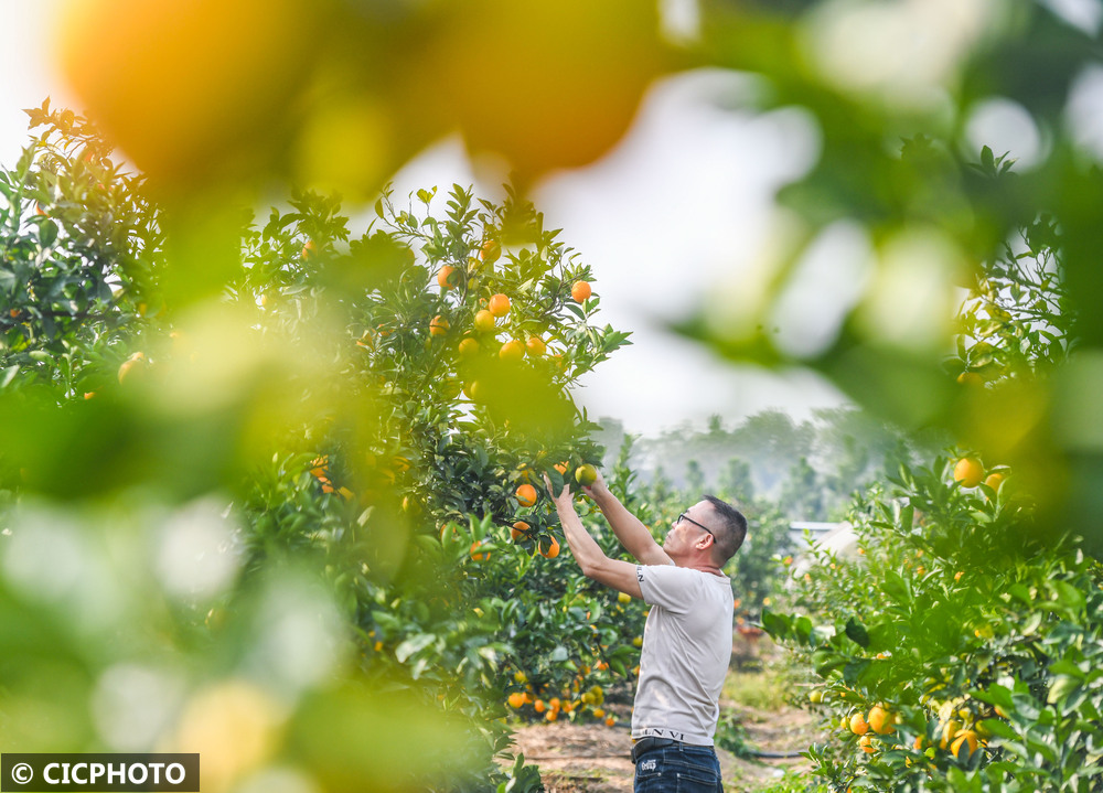 ↑2024年11月3日,湖南省永州市道县东门街道新立村,果农在采摘脐橙。CICPHOTO/蒋克青 摄