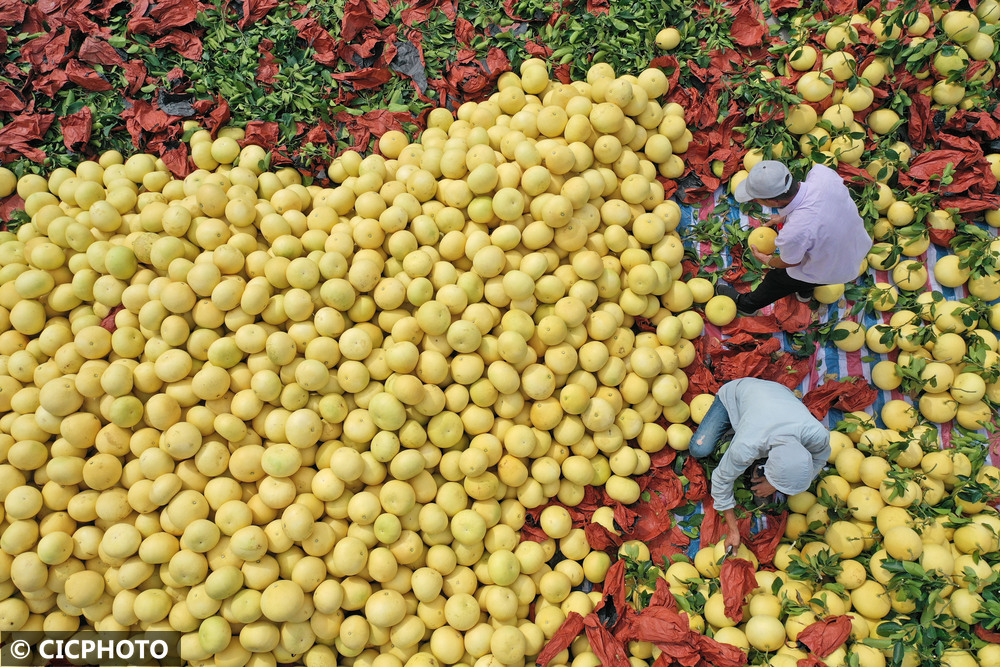 ↑2024年10月20日,浙江省玉环市清港镇,农民在分拣刚采摘的玉环文旦。(无人机照片)CICPHOTO/段俊利 摄