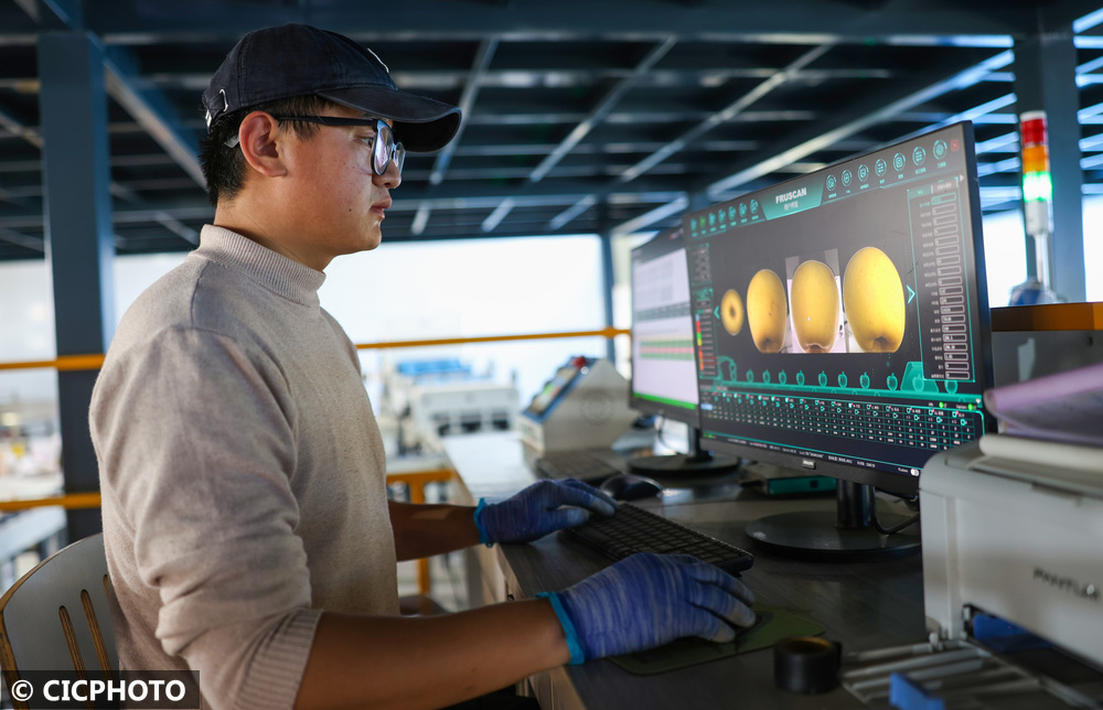 ↑2024年10月30日,山东省荣成市伟德山森林公园一处果园,果农在智能化分拣库监测黄金维纳斯苹果质量。CICPHOTO/李信君 摄